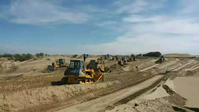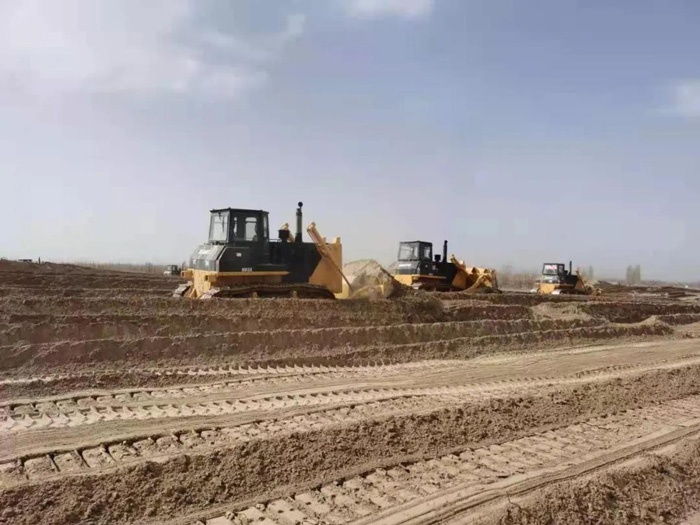 項(xiàng)目施工方考慮到沙漠惡劣的施工環(huán)境,經(jīng)過多方比較,最終選擇山推推土機(jī)、裝載機(jī)、平地機(jī)一體化產(chǎn)品機(jī)群作為項(xiàng)目施工的“主力軍”,承擔(dān)治沙平整土地、土方施工作業(yè)。山推也不辱使命,憑借出眾的施工效率、穩(wěn)定的產(chǎn)品性能、及時(shí)的售后服務(wù)保障,確保項(xiàng)目進(jìn)度順利進(jìn)行。
