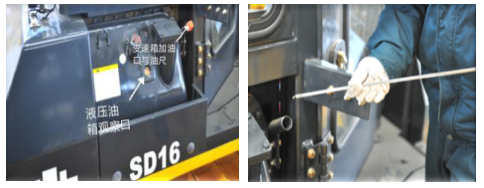 檢查工作油箱油位與變數(shù)箱油位注意:熄火后整機(jī)處于平坦地面,鏟刀、松土器落下后,油位處于中位時(shí)為正常。